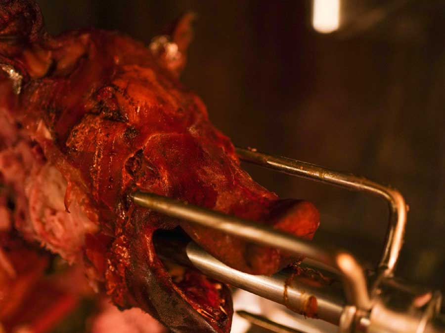 Neben dem klassichem leiblichen Wohl wie Pommes, Bratwurst und Glühwein, warteten auch zwei Spanferkel auf Abnehmer.